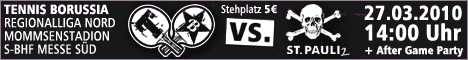 Für das Regionalliga-Spiel gegen den FC St. Pauli II hat der Vorverkauf begonnen. Eintrittskarten zum Einheitspreis von 5€ (Stehplätze) bzw. 10€ (Sitzplätze) sind in der Geschäftsstelle von Tennis Borussia in der Waldschulallee 34-42 erhältlich. Jugendliche bis zum 16. Lebensjahr zahlen mit dem Youngster-Ticket wie immer 3€ und unsere Kleinsten (6 Jahre und jünger) kommen umsonst ins Stadion.