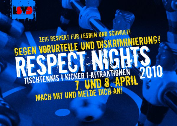 Für alle, die heute ein bisschen länger wach bleiben wollen, bietet der LSVD als Abendprogramm die Respect Nights an. Als Vorbereitung auf die Respect Gaymes am 05.06.2010 im Jahn-Sportpark kann jeder, der Lust hat, sich schon heute ab 18:30 im SportJugend Club Lychi an der kleinen Version unter Beweis stellen und ein Zeichen für Respekt setzen.