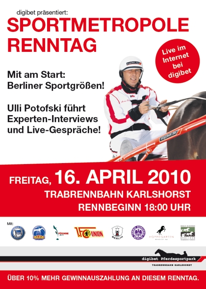 Auf der Trabrennbahn Karlshorst wird am morgigen Freitag eine Veranstaltung besonderer Art stattfinden. Ab 18:00 Uhr präsentiert der Wettanbieter digibet den Sportmetropole-Renntag, für den die bekanntesten Berliner Sportvereine Rennpatenschaften übernommen haben. So gibt sich neben Alba Berlin, dem EHC Eisbären, den Reinickendorfer Füchsen und den Berliner Profifußball-Vereinen auch Tennis Borussia die Ehre.