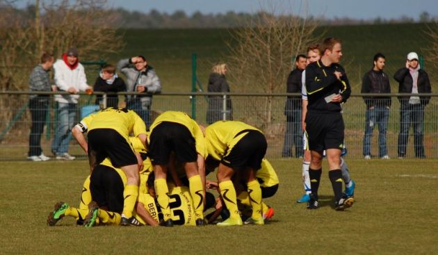 TeBe profitierte von einem frühen Führungstreffer durch Manuel Zemlin, der bereits nach zwei Minuten einen Freistoß aus zentraler Position verwandelte. Doch der Jubel des zahlreich mitgereisten Anhangs war noch nicht verklungen, da bemühten sich die Gastgeber bereits nach Kräften um eigene Offensivaktionen. Eine ganze Reihe von Standardsituationen musste die TeBe-Defensive über sich ergehen lassen, jedoch ohne dabei ernsthaft in Bedrängnis zu geraten. Leider blieben die Spielanteile auch nach der roten Karte gegen Kljajic (34.), als dieser an der Mittellinie zur Grätsche ansetzte, weiterhin zugunsten der Gastgeber verteilt. Umso größer war die Freude unter den Borussen, als Touré kurz vor dem Pausenpfiff nach einer missglückten Ecke von rechts noch die Gelegenheit zum Nachschuss erhielt und dabei – vorbei an Freund und Feind und unter Zuhilfenahme des linken Pfostens – den Ball einnetzen konnte. Im Nachhinein ist der psychologische Wert eines weiteren Treffers so kurz vor der Halbzeit kaum hoch genug einzuschätzen.