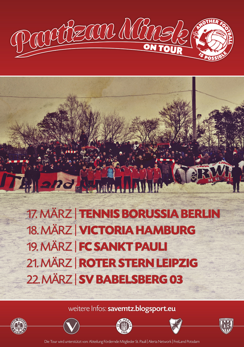 Ein Bündnis aktiver Fans der oben genannten Vereine und von Altona 93 möchte das Team von Partizan Minsk vorstellen und beweisen, dass die Idee von einem anderen Fußball auch im Osten Europas lebt. Dafür benötigt das Bündnis auch noch finanzielle Hilfe. Wer die Tour von Partizan Minsk unterstützen möchte, spendet bitte an: