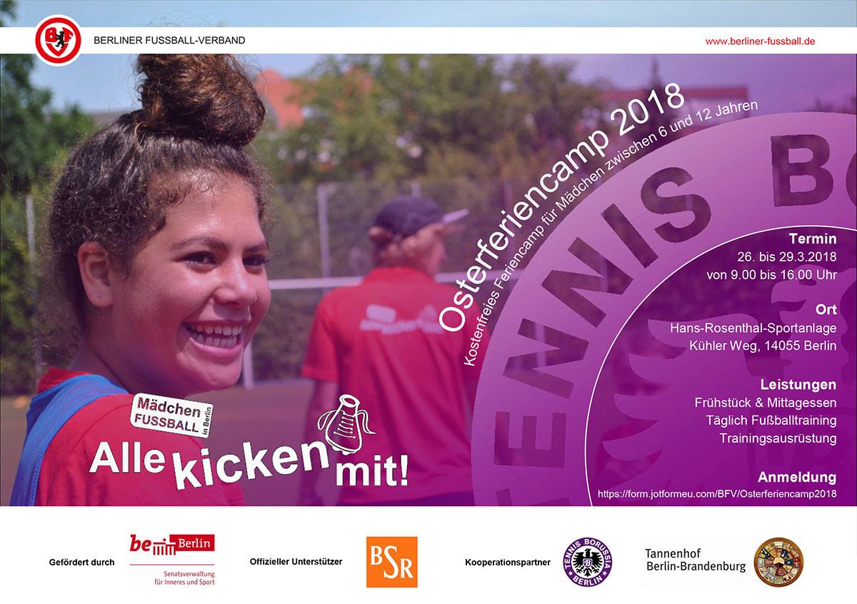 In Kooperation mit dem Mädchenfußballprojekt „Alle kicken mit!“ des Berliner Fußball-Verbandes eröffnet Tennis Borussia die kommenden Osterferien mit dem ersten Feriencamp des Jahres! Vom 26. März bis einschließlich 29. März 2018 können sich bis zu 50 Mädchen zwischen 6 bis 12 Jahren immer in der Zeit von 9 bis 16 Uhr auf dem Trainingsgelände der Hans-Rosenthal-Sportanlage (Kühler Weg 12, 14055 Berlin) mit dem Ball am Fuß austoben und dabei spielerisch von unseren qualifizierten Trainer*innen Tipps und Tricks zu ihren Fertigkeiten mit dem runden Leder erhalten.