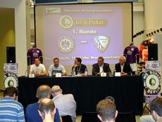 Rege diskutiert wurde über die Chancen des vermeintlich Kleinen, über die zu erwartende Zuschauerzahl und in einer Nachbetrachtung über das Spiel gegen den 1. FC Union Berlin. Vorstandsvorsitzender Peter Antony, Sportlicher Leiter Ronny Maschke, Trainer Theo Gries und Kapitän Stephan Schmidt standen über 30 Minuten Rede und Antwort.