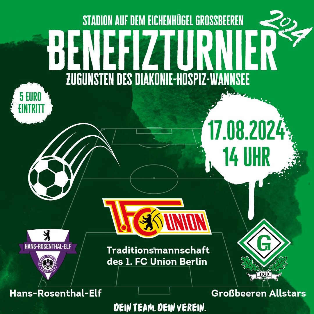 Am Samstag, den 17. August 2024, tritt die Hans-Rosenthal-Elf beim Benefizturnier in Großbeeren an und unterstützt mit diesem Turnier das Diakonie-Hospiz Wannsee. Neben den Großbeeren Allstars konnten wir die Traditionsmannschaft des 1. FC Union Berlin gewinnen. Die Köpenicker wollen u.a. mit ihren Legenden Ronny Nikol, Marco Gebhardt, Christoph Menz, Karim Benyamina und Chibuike Okeke antreten.
