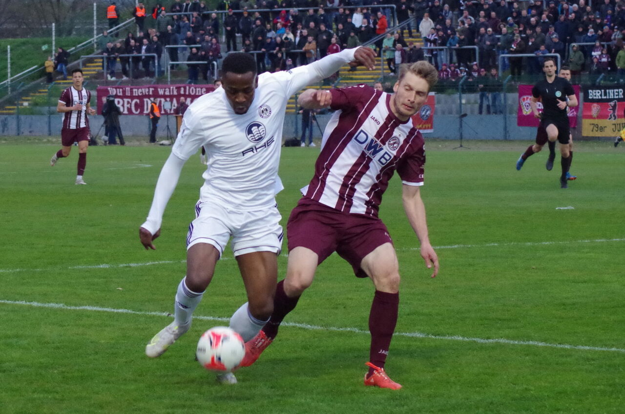 Erst nach rund einer halben Stunden schafften es die Lila-Weißen, die unter anderem ohne Junge-Abiol auskommen mussten, sich etwas aus dem Druck des BFC zu befreien und selbst nach vorne zu spielen. In der 37. Minute gab es sogar die Chance zum 1:0 für TeBe: Montcheu errang nach einem Abwehrfehler den Ball und lief so gut wie frei aufs Tor zu, zögerte vor dem Abschluss aber einen Moment zu lang und verlor den Ball doch noch.